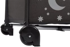 Onderaan het campingbedje zitten 2 wieltjes met remmen voor een gemakkelijke verplaatsing. Verder komt het campingbedje inclusief matrasje en is hij te gebruiken tot een maximum van 15 kg (ongeveer 3 jaar).