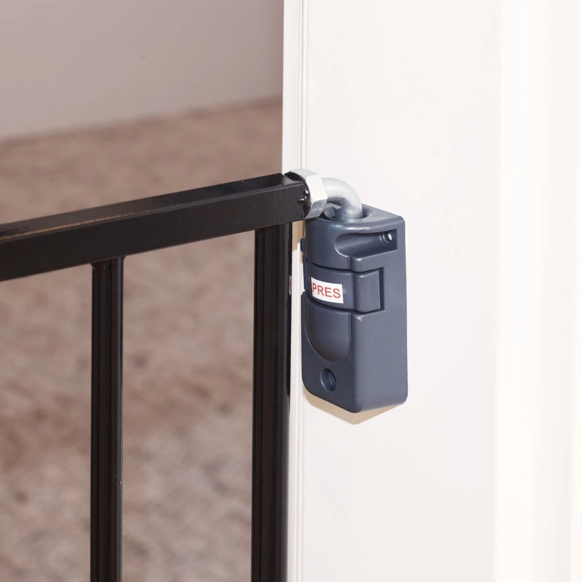 Doordat dit traphek is voorzien van een Wallfix bevestiging ben je zeker van een veilige afsluiting van de trap- of deuropening. Je maakt het traphek vast door middel van schroeven in de deurpost. Het hekje is enkel geschikt voor gebruik binnenshuis en past in deuropeningen van 62 tot 102 centimeter breed.
