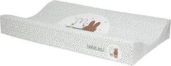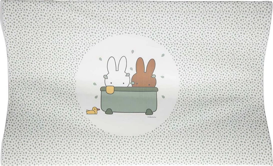 Op dit comfortabele aankleedkussen van Bebe-Jou heb je je kindje in een handomdraai gewassen en aangekleed! Hij heeft een groene allover stipjes print met centraal een schattige afbeelding van Nijntje en Nina. Door de waterafstotende laag is het kussen gemakkelijk schoon en droog te maken, handig bij het wassen of in geval van een ongelukje!