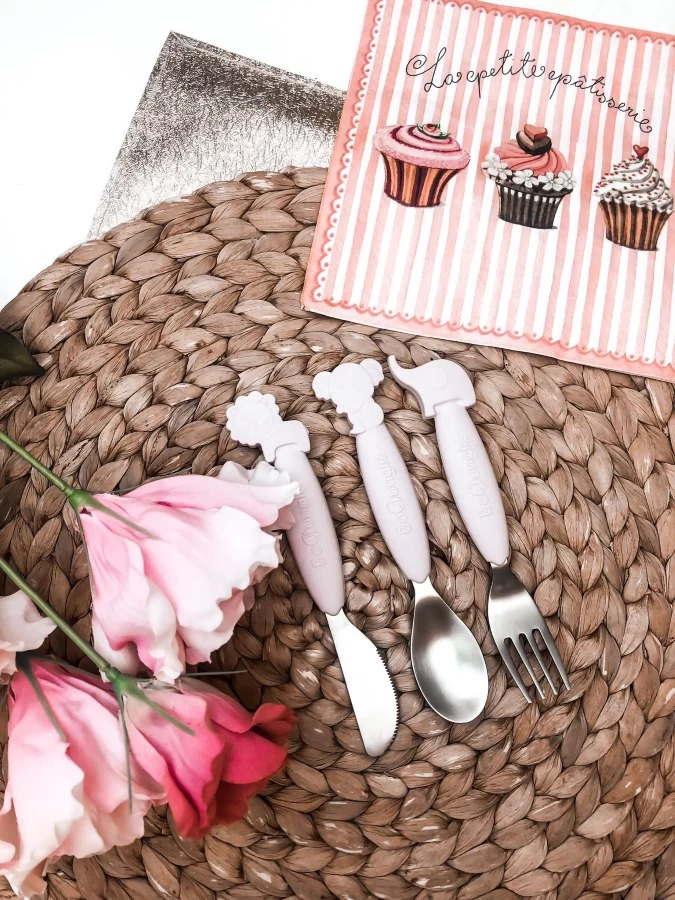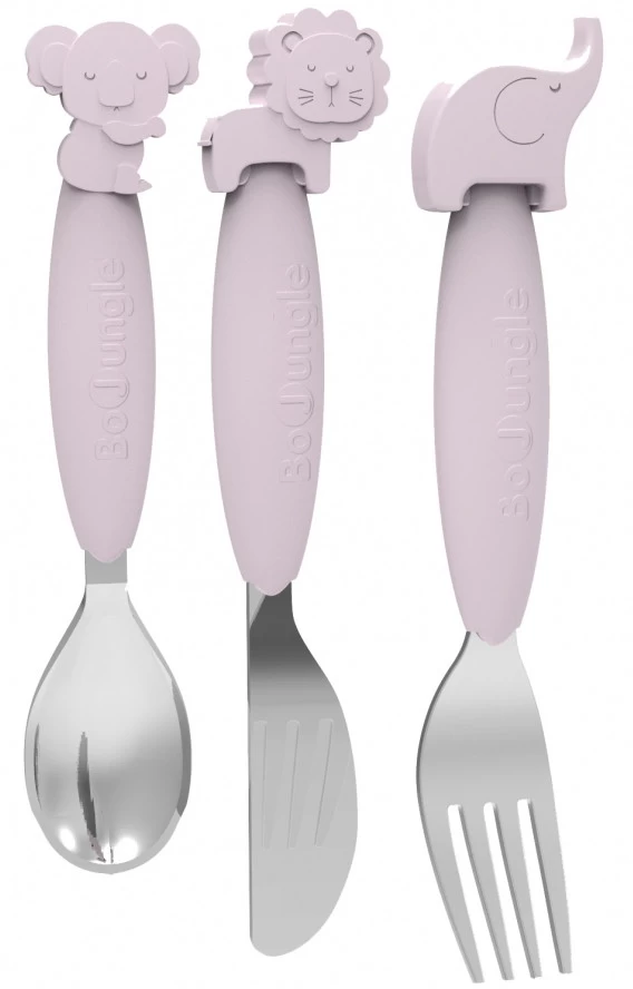 Het bestek heeft een siliconen handgreep in combinatie met roestvrij staal. De schattige dierenfiguurtjes (koala, leeuw en olifant) maakt het zelfstandig leren eten meteen stuk leuker! Smakelijk eten!