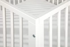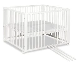 De box is 105 x 101 cm breed en de binnenmaat is 100 x 96 cm. De bodem van de box is in 5 hoogtes te verstellen en groeit dus mee met je kleintje. Daarnaast heeft de box 3 verwijderbare spijlen.Â