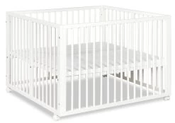 De box is 105 x 101 cm breed en de binnenmaat is 100 x 96 cm. De bodem van de box is in 5 hoogtes te verstellen en groeit dus mee met je kleintje. Daarnaast heeft de box 3 verwijderbare spijlen.Â