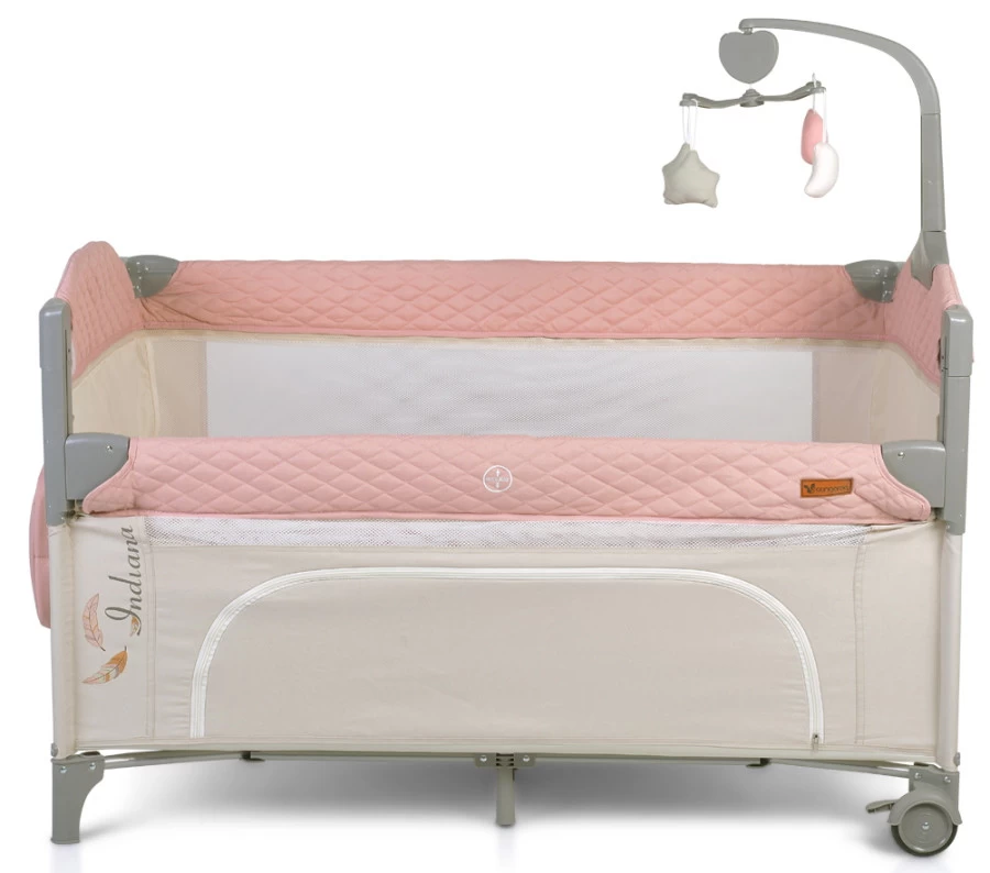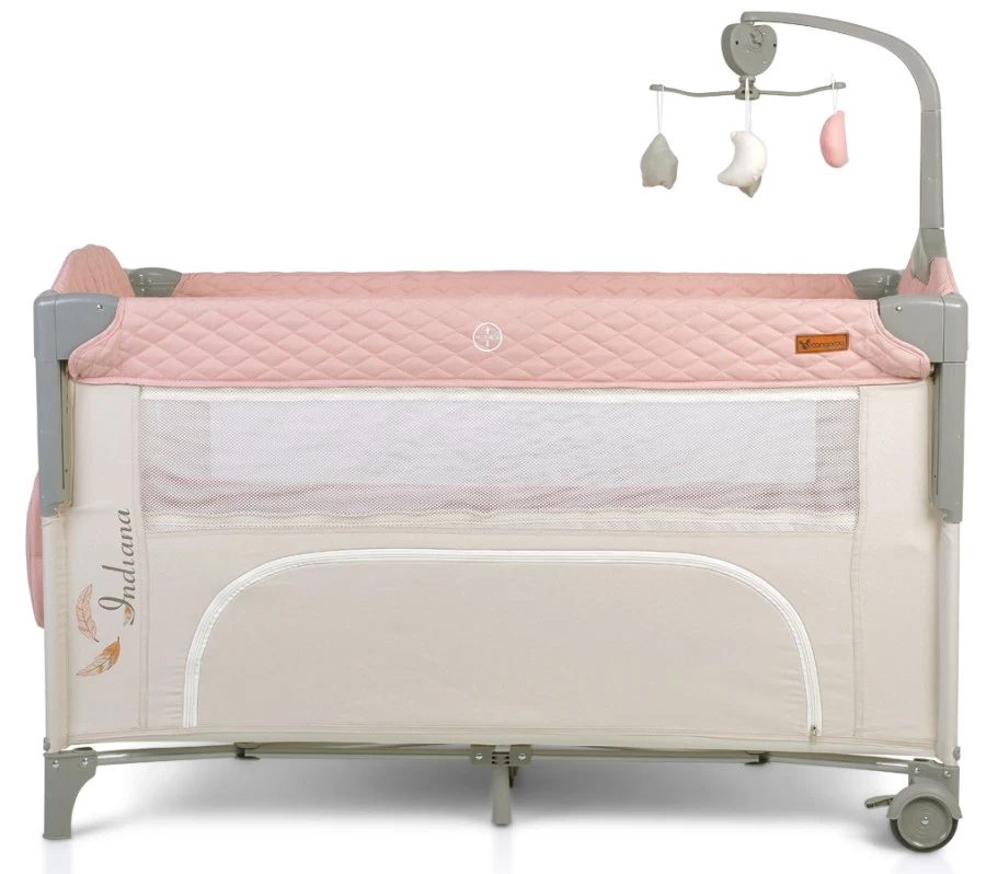 Het Indiana campingbedje heeft mesh zijkanten, zodat je je kindje goed in de gaten kunt houden en er een goede luchtcirculatie is. Daarnaast heeft hij 2 wieltjes om het bedje gemakkelijk te verplaatsen, een interne organizer aan de zijkant en een leuke muziekmobiel met 4 knuffeltjes! Tevens heeft het bedje een klein rugzakje/luiertas om de nodige spulletjes voor je kindje in op te bergen.