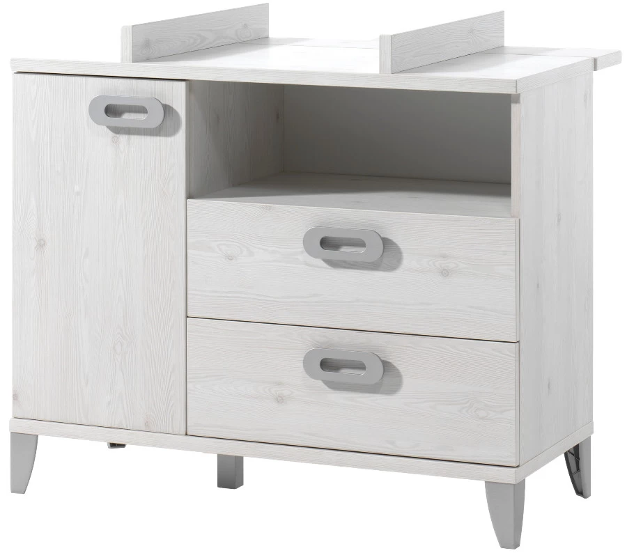 De commode is uitgerust met een deurtje, 2 lades en een open vak. Zo heb je alles wat je nodig hebt tijdens de verzorging van je kleine of tijdens het aankleden lekker bij de hand, maar kan je het ook netjes opbergen.