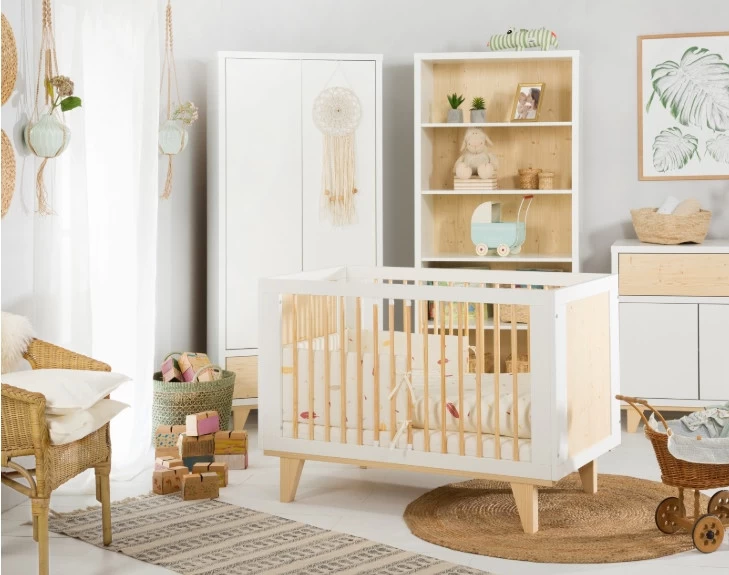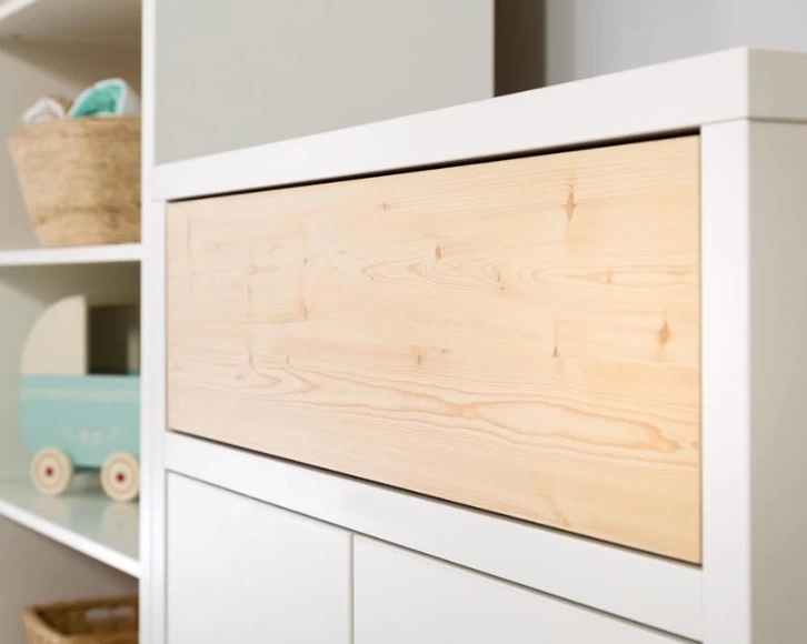 De commode Nieke is een stevige en moderne commode waarbij een nature-hout kleur gecombineerd wordt met een strakke witte kleur. De commode heeft twee deurtjes en een grote laden die te openen zijn door er tegen te duwn (‘push to open’). Je hebt met deze commode meer dan genoeg ruimte om alle verzorgingsspulletje van je kleintje in op te bergen.