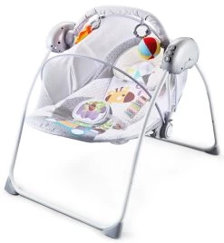 De babyschommel heeft een speelboog waar twee vrolijke speeltjes aan hangen, deze zijn tevens afneembaar. Hij is geschikt voor kindjes vanaf de geboorte (tot ong. 9 kg) en is erg compact inklapbaar, zodat je hem in no-time op kunt bergen als je de schommel even niet gebruikt! Te gebruiken met batterijen (niet inbegrepen) of adapter (inbegrepen).