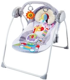 De babyschommel heeft een speelboog waar twee vrolijke speeltjes aan hangen, deze zijn tevens afneembaar. Hij is geschikt voor kindjes vanaf de geboorte (tot ong. 9 kg) en is erg compact inklapbaar, zodat je hem in no-time op kunt bergen als je de schommel even niet gebruikt! Te gebruiken met batterijen (niet inbegrepen) of adapter (inbegrepen).
