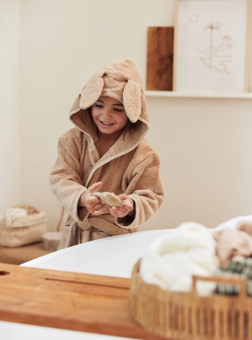 Het badjasje is gemaakt van 100% badstof katoen en is ideaal voor thuis of voor op vakantie. Hij is geschikt voor kindjes vanaf 1 tot ongeveer 2 jaar. De badjas is machinewasbaar op 40°C. Daarnaast kan het badjasje in de droger en mag hij gestreken worden.