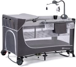 Dit campingbed is uitgerust met een hoop extra accessoires! Zo wordt het bedje geleverd inclusief extra poten voor een schommelfunctie, een speelmobiel, een aankleedvlak en een handig rekje om alle verzorgingsspulletjes van je kleine in op te bergen. Extra handig én een complete set dus!