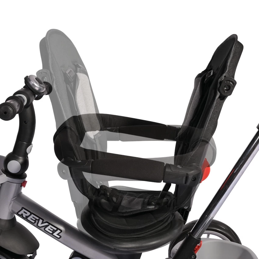 Aan de achterkant van de driewieler kun je makkelijk een duwstang (90-95cm) bevestigen waar je je kindje op de driewieler mee rond kunt duwen. Dit is erg leuk wanneer je graag wandelingen maakt en je kindje snel moe is of wanneer je kindje nog niet goed (zelfstandig) kan fietsen. De duwstok heeft twee standen en aan het handvat zit zelfs een bekerhouder! Wanneer je je kleine duwt met de duwstok, kan je kindje makkelijk zijn/haar voeten veilig op de voetensteun zetten, deze zit aan de onderkant van de driewieler en kun je in- en uitklappen. De stoel is 360º te draaien zodat je kindje met zijn/haar gezicht ook richting jou kan kijken.