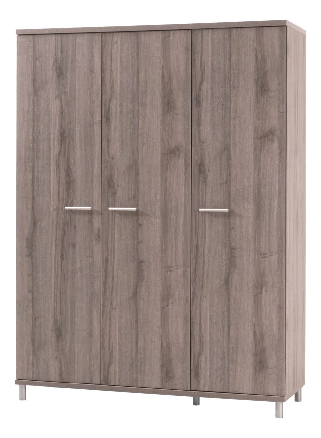 3-Deurskast Naomi past perfect in iedere baby- of kinderkamer. Deze mooie kast biedt zeer veel ruimte om de kleding van je kleine in op te bergen. De kast is gemaakt van hoogwaardig plaatmateriaal met melamine en is dus ook zeer stevig. Deze kast heeft 3 openslaande deuren van grijs houtlook met zilveren grepen. De binnenkant bestaat uit een groot hanggedeelte en een aantal planken.