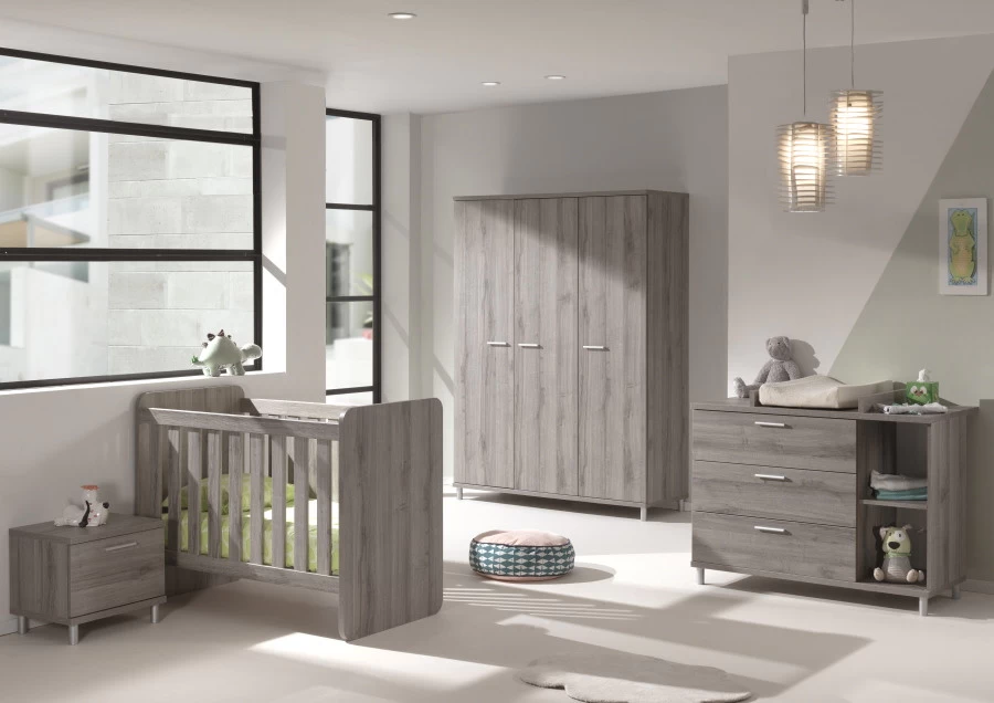 Deze Meegroei Babykamer Naomi bestaat uit een Meegroei Ledikant, een 3-Deurskast en een Commode. Alles is strak afgewerkt in een mooie, grijze houtlook. Babykamer Naomi past in elk interieur en groeit met jouw kindje mee, zo hebben jullie er lang plezier van!