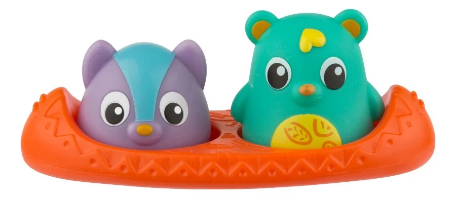 Meneer de beer en het kleine wasbeertje zitten gezellig samen in de kano. Zie hoe leuk het is als de twee vriendjes voorbij komen drijven. Je kleintje kan de twee diertjes ook uit de boot halen en zelf er weer in zetten. Zo stimuleer je de motorische ontwikkeling van je kleintje ook nog eens. De vrolijke beestjes maken van baddertijd een groot feest!
