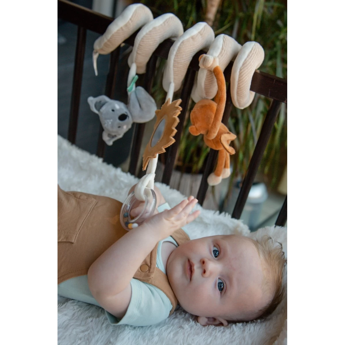 De boxspiraal bestaat uit een aap en koala knuffeltje en een spiegeltje met manen en rammelaar! Genoeg activiteiten om je kindje te stimuleren om ernaar te grijpen en lekker mee te spelen.