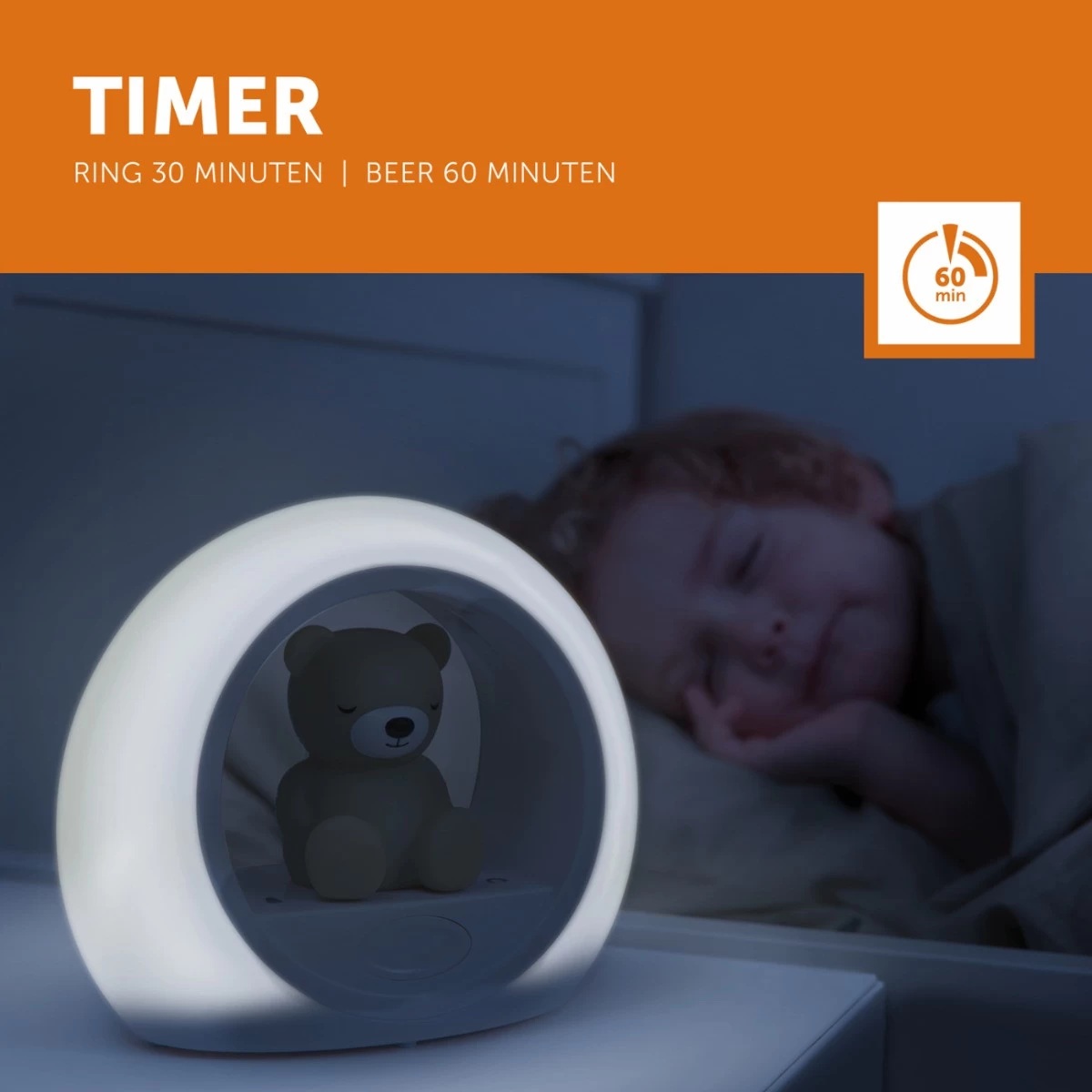 De geluidssensor zorgt ervoor dat wanneer je kleintje ’s nachts huilt, het beertje automatisch even aangaat zodat je kindje kan zien dat er niets aan de hand is en hij/zij nog steeds veilig thuis is. Als de rust weer terug is schakelt Billy zichzelf weer uit. Met de timer functie kun je instellen dat de ring rondom Billy na 30 minuten uitgaat en Billy zelf na 60 minuten. Ook de felheid is aan te passen zodat je hem tijdens het naar bed gaan lekker fel kunt zetten. Gaat je kleine slapen? Dan kan je het lichtje gemakkelijk dimmen.