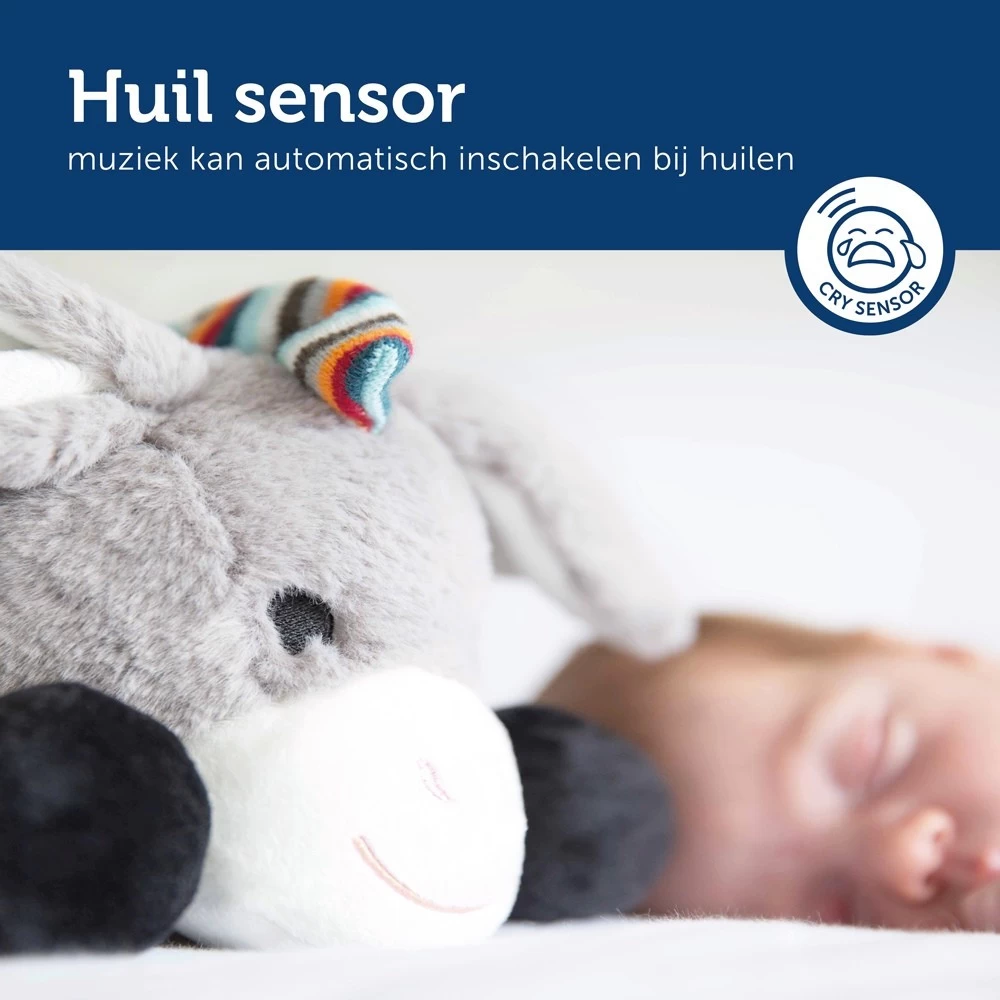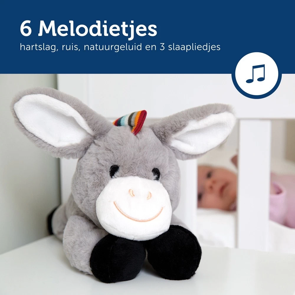 Met dit leuke kalmerende Ezeltje van Zazu zal je kindje heerlijk slapen! Deze leuke zachte knuffel, die vast te maken is aan de box of het bedje, produceert zes verschillende geluiden. Vier rustgevende melodietjes, het geluid van een waterval en het geluid van een hartslag die van de moeder is nagebootst.